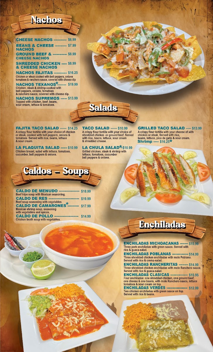 Flour deep fried taquitos with chicken or beef. Served with rice, cream, and salad.