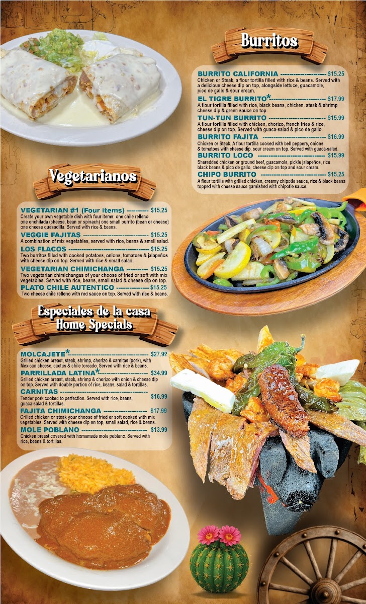 Chicken or steak, a flour toritlla filled with rice and beans. Served with a delicious cheese dip on top. Lettuce, guacamole, pico de gallo and sour cream.