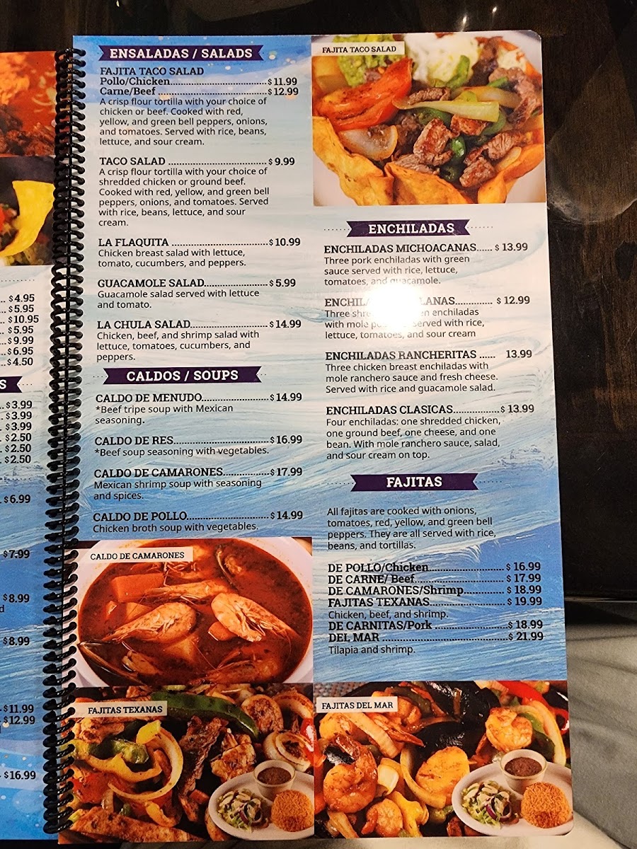 Chicken breast sliced with shrimp and bacon. Cooked with bell peppers and onions. Served on a bed of rice with cheese dip and tortillas.